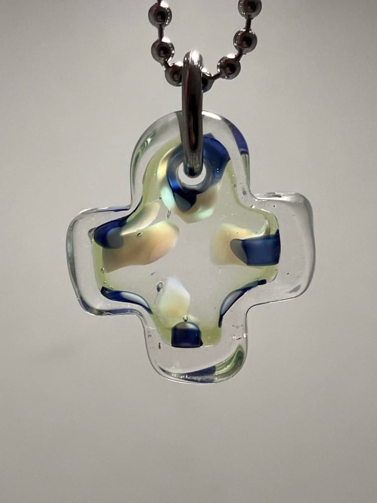 clear with blue, white, translucent green borosilicate glass plus pendant. comes with stainless steel jump ring and 24" ball chain (can be trimmed shorter)