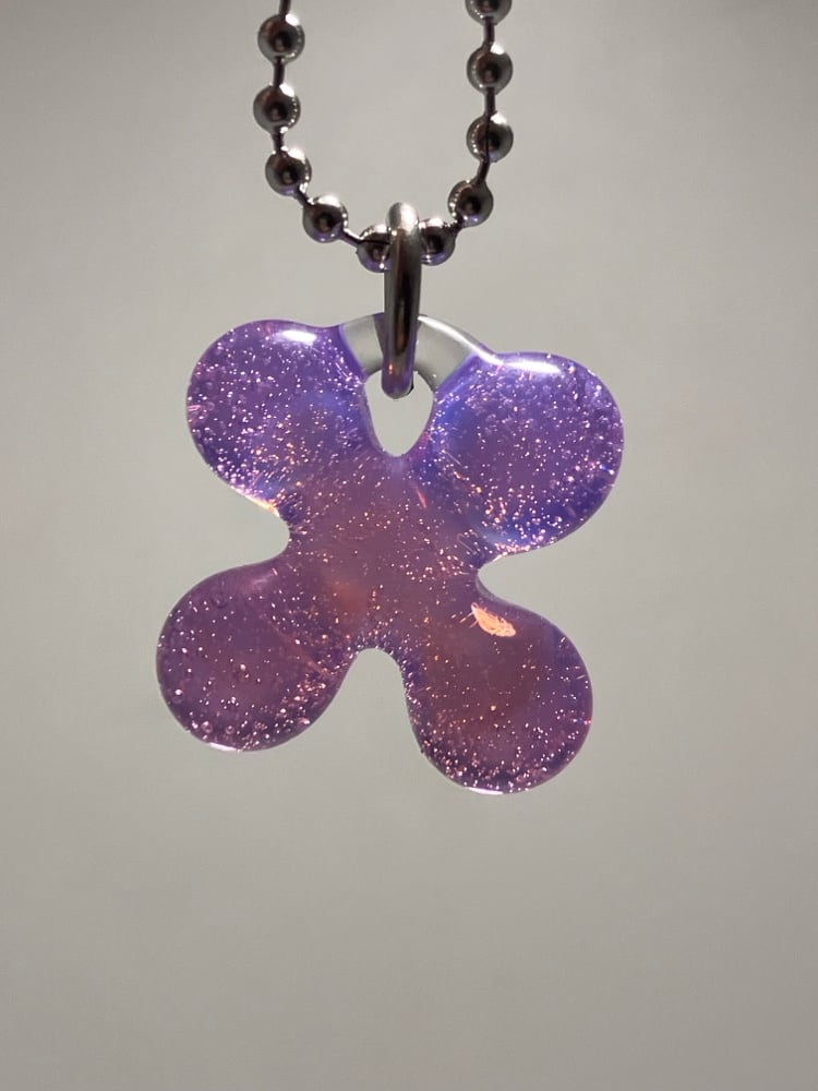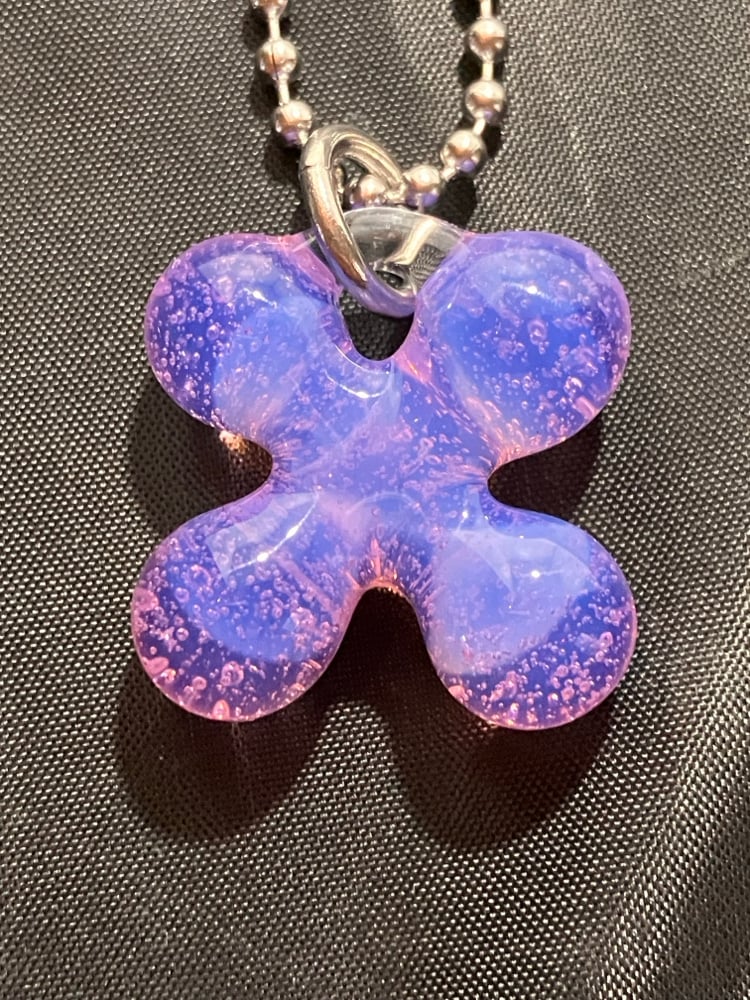 opaline pink borosilicate glass clover pendant. comes with stainless steel jump ring and 24" ball chain (can be trimmed shorter)