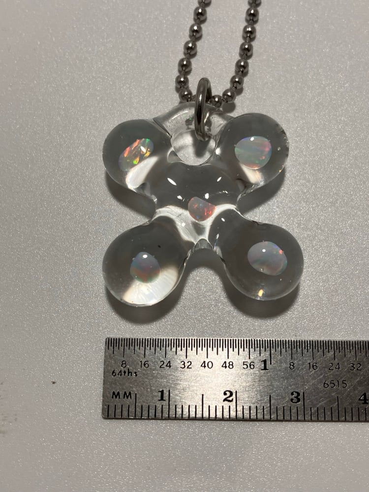 clear with five Gilson opals, borosilicate glass clover pendant. comes with stainless steel jump ring and 24" ball chain (can be trimmed shorter)